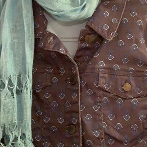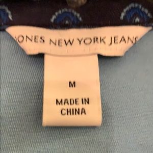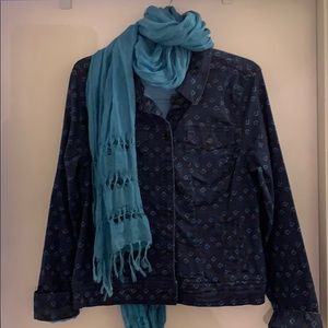 Jones New York blue pattern denim jacket with front pockets. Material stretches for a comfortable fit. Looks great with jeans.