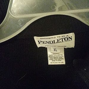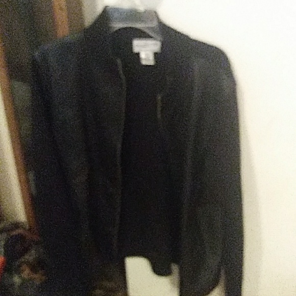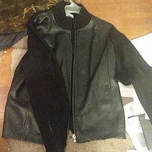 Leather front with knit sleeves in collar and back. Side pockets. Semi dressy.