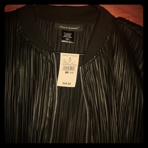 Black lightweight polyester 'crop' jacket. Fits as a cropped jacket for those that are tall. Polyester and spandex. Sort of a plastic feel... you'll know what I mean if you've had something similar before. It doesn't make noise though.