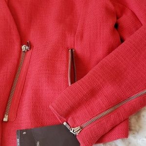 Never before worn jacket. It has really cool zipper detailing in the sleeves and actual small zipper pockets in front.