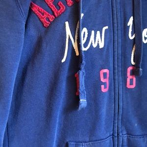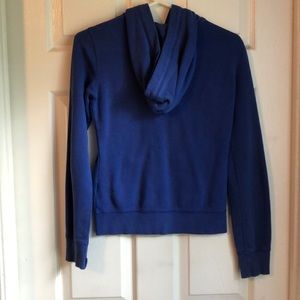 Dark blue hoodie jacket. Very comfortable and warm. One of the hoodie strings is frayed.