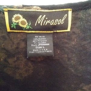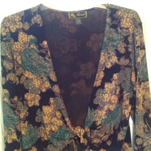 Jacket that ties in front. Blue, black, tan. Very lightweight material. 3/4 sleeves.