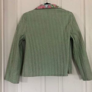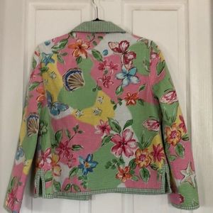 Colorful floral jacket on one side and a gingham plaid on the reversible side. Machine washable.