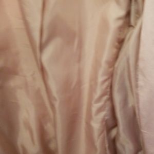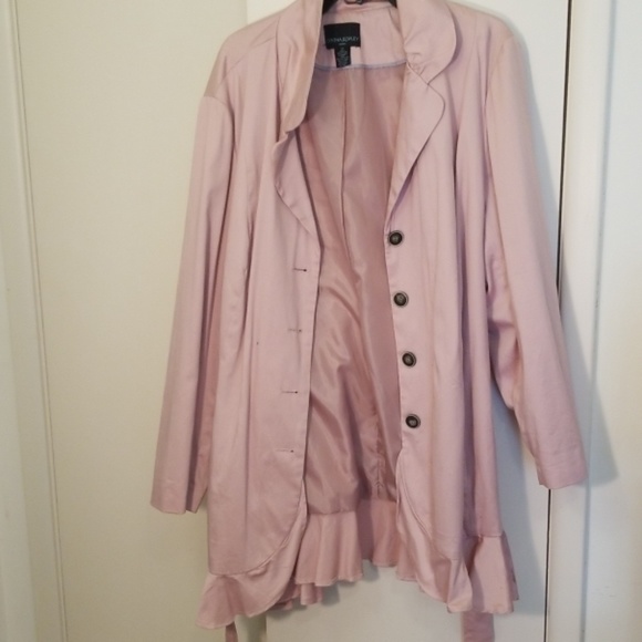 Pale pink rain jacket or utility with a ruffle bottom hem. 33.5 inches from the center of the back down to gem.