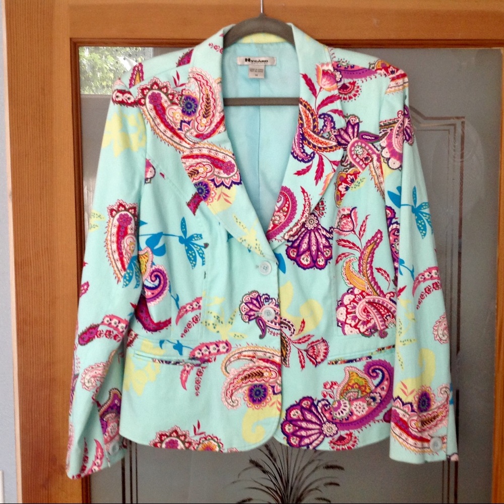 Beautiful aqua background, mult-color paisley print jacket. 95% cotton, 5% spandex, fitted slightly, washable. This jacket would look great with jeans or dress!