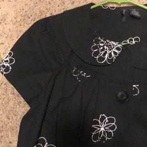 Short jacket has two buttons at the top - floral print with a collar - jacket is waist length and can be dressed up