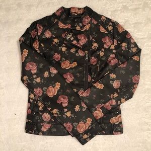 Step into fall with a classic jacket that has a twist. This beautiful rose design is sure to be an eye catcher and spice up your closet basics with no effort at all. Can’t you see this with a dark skinny jean, cream top and some riding boots? (In new condition)