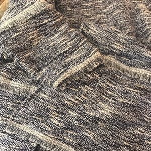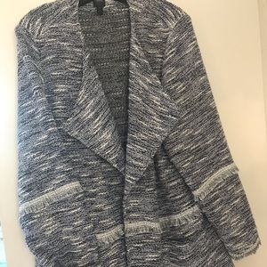 Adorable navy and white jacket with cute fringe detail around elbow and cuffs and waist and bottom. Two patch pockets in front.