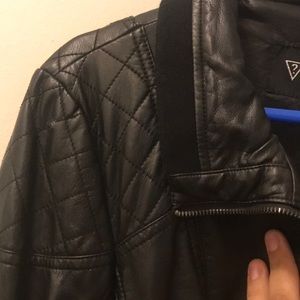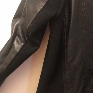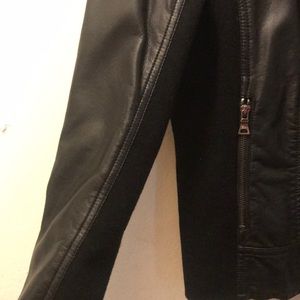 Black jackets, two types of material on sleeves, side and collar of neck, Zipper front pockets, zipper closure on the front, Long sleeve crisscross pattern on shoulders