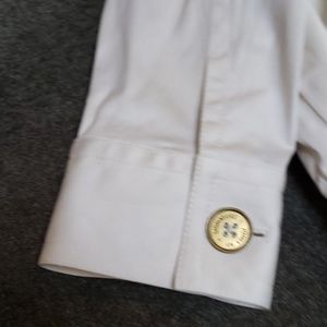 Nice weight to jacket. Antique gold buttons and on sleeves. Antique gold buckle on both sides is adjustable. Nice detailing