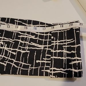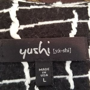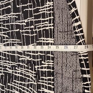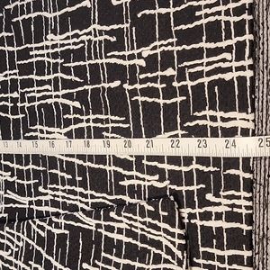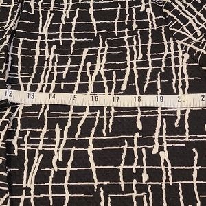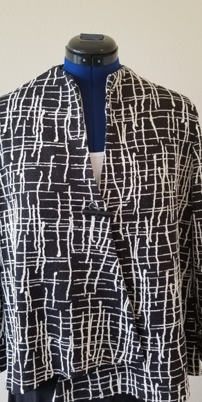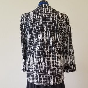Black and off white geometric pattern woven fabric jacket with elongated back.