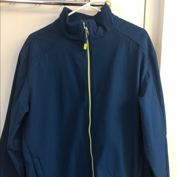 Bright navy blue jacket that is fleece lined in the same color. It has two neon green zippered pockets outside and two open pockets inside