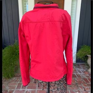 Red jacket with light fleece lining and mesh pockets that zip. 2 slant side pockets and 1 vertical chest pocket. Face 100% Nylon and back is 100% Polyester. Machine wash. Very good condition.