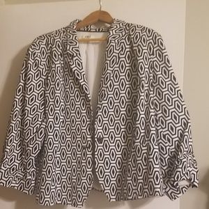 Plus size black and white geometric jacket with tufted three quarter length sleeves.
