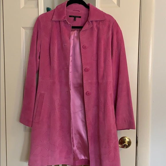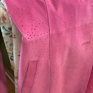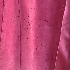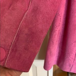 Beautiful lipstick pink suede jacket falls just below the knee. Some discoloring on sleeves. Fun flower designs in a hole punch method. Has pockets