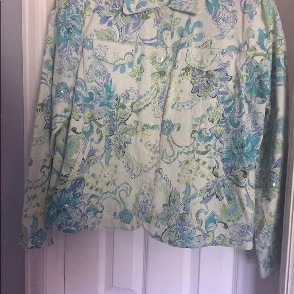 Unlined turquoise, seafoam green and periwinkle blue floral design jacket with a little bit of bling from the sequins sprinkled here and there.