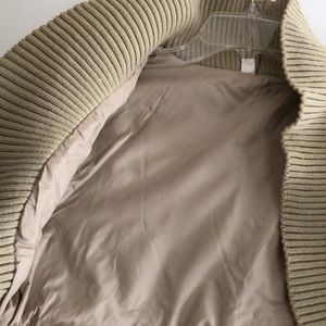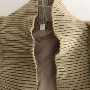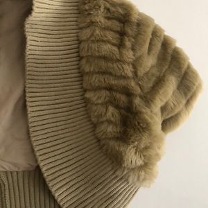 Light tan short sleeved shawl type jacket. Ribbed around faux fur. Soft and cozy. Great accessory to a dressy affair. 15” from collar to bottom of hem.