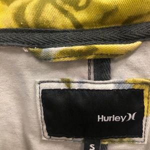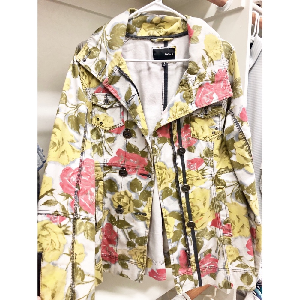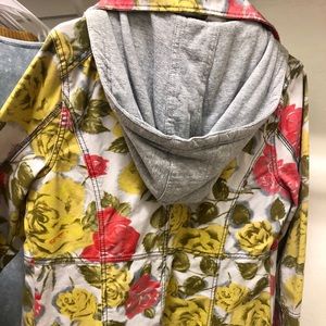 Worn once. Zips and buttons up. Hooded. I would say it would fit a size 4 woman to size 8. Can wear loose or zip/button. Jean material. Fun floral print