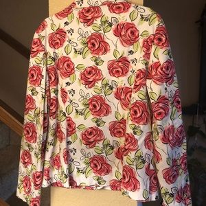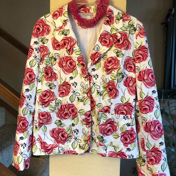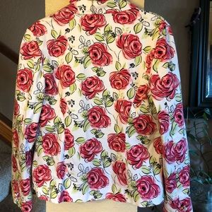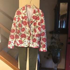 White lined jacket with pink flowers and green leaves. 97% cotton 3% spandex lining 100% polyester