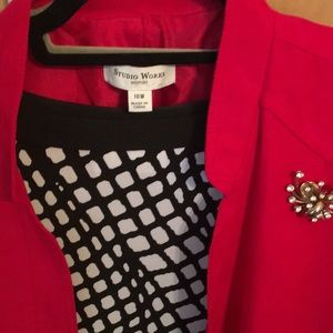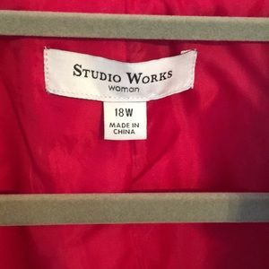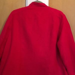 Ultra Suede feel. Cute Holiday Jacket more of a ruby red, not cherry red. Comfortable fit and has zippered pockets. EUC