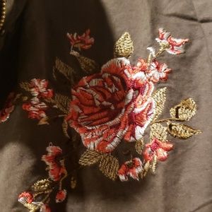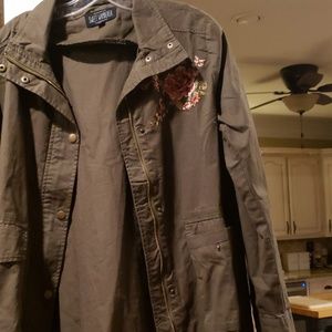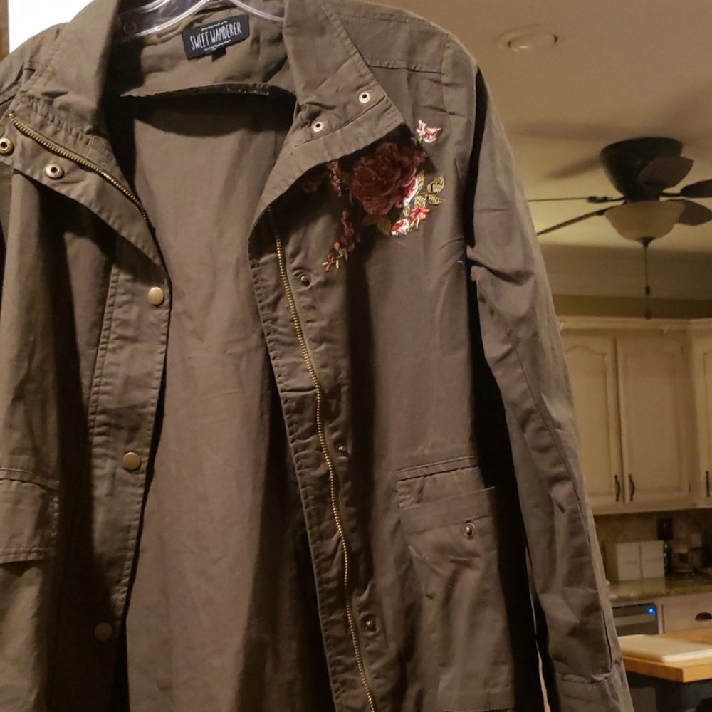 Green with embroidery on top shoulder. Front pockets zipper and snaps in front. Cute jacket.