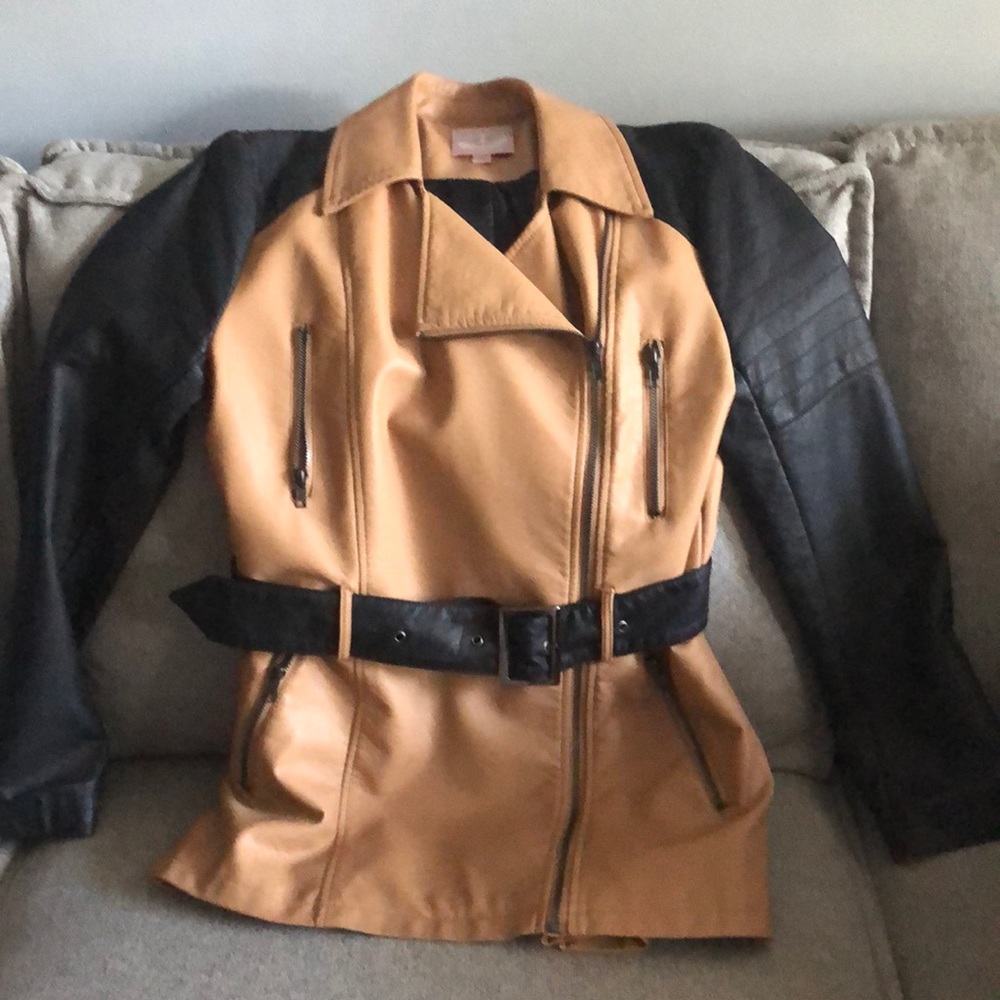 Leather like belted jacket. Excellent condition!