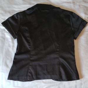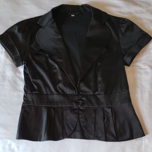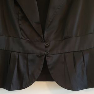 Jacket. Polyester but looks and feels like black satin. Cute button details, pleating, and stretchy material.