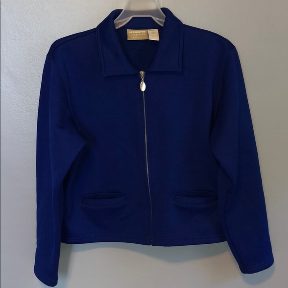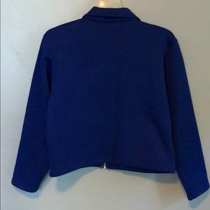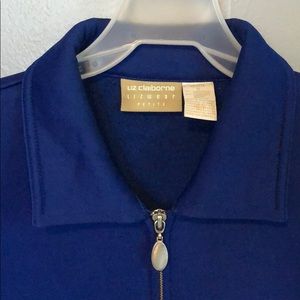 Electric blue Liz Claiborne jacket with zipper and two front pockets size petite small. 75% polyester & 25% cotton.