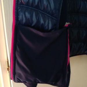 Quilted front and back, soft fleece like sleeves, 2 outer zip pockets, 2 inner pockets