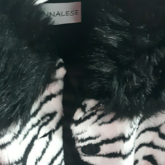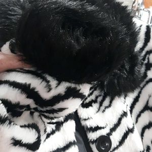 Zebras print short jacket with black fur trim.