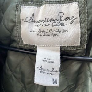American rag army green jacket with gold hardware. Has zipper and buttons to keep you warm
