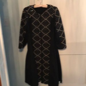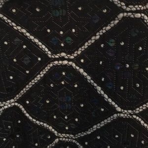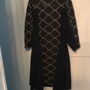 Black beaded with wide print. Flared bottom with solid black pleats. Maxi length. Long sleeve