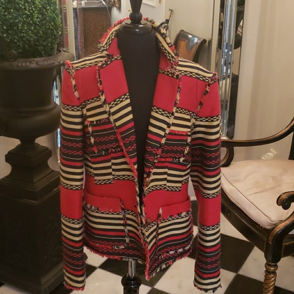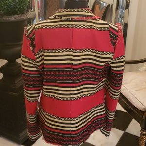 Lovely structured patterned jacket. Native Indian print look. 2 buttons, 4 pockets, sleeve length 22", 18" inseam, width across 16".