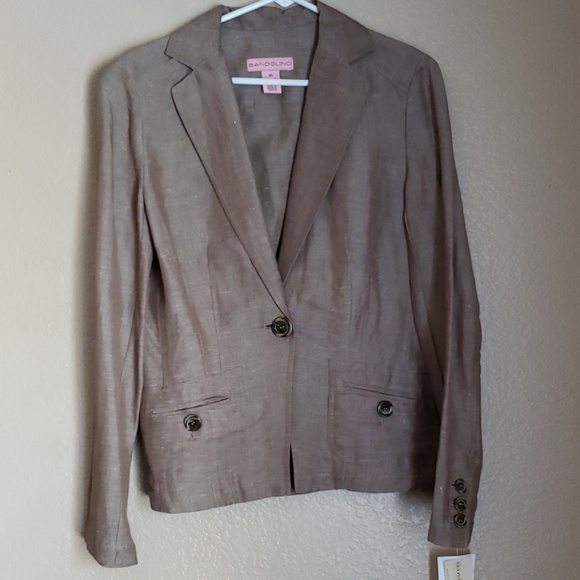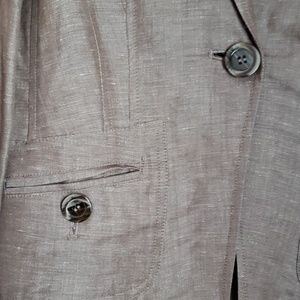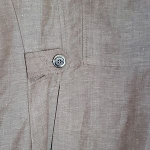 Brown linen jacket with one button closer to pockets and front long sleeves button detail in back and on sleeves