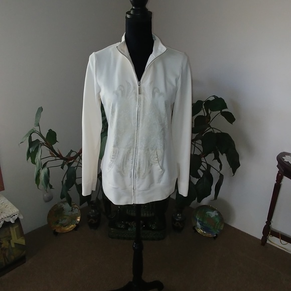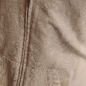 Like a hoodie. Cream colored with silver and gold scrolling.
