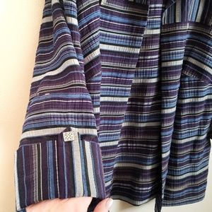 Lightweight open front jacket to be worn over shell. Purple, sky blue, lt grey, and navy come together to work with many looks. Burn out stripe adds to the look. Silver tone buttons on front and cuffs for decoration.
