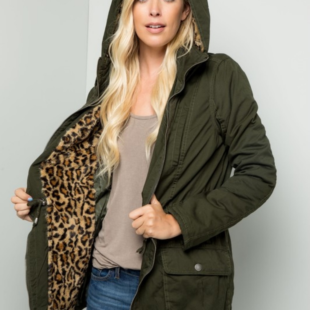 Nwt. Olive green jacket lined with soft/warm leopard material
