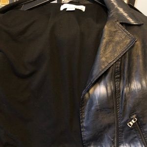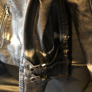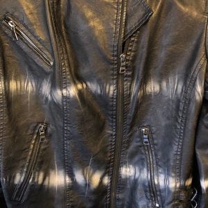 Bomber style jacket multitie-dye black and white, worn once, embellished with zippers and side buckles, front zips up with snaps.