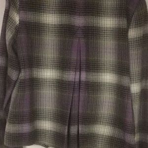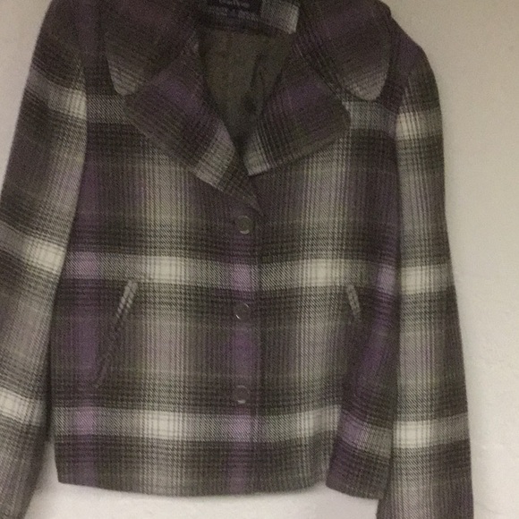 Plaid Evan Picone blazer. Size 12. Colors are white, purple and brown.