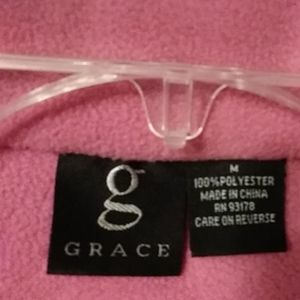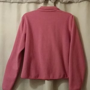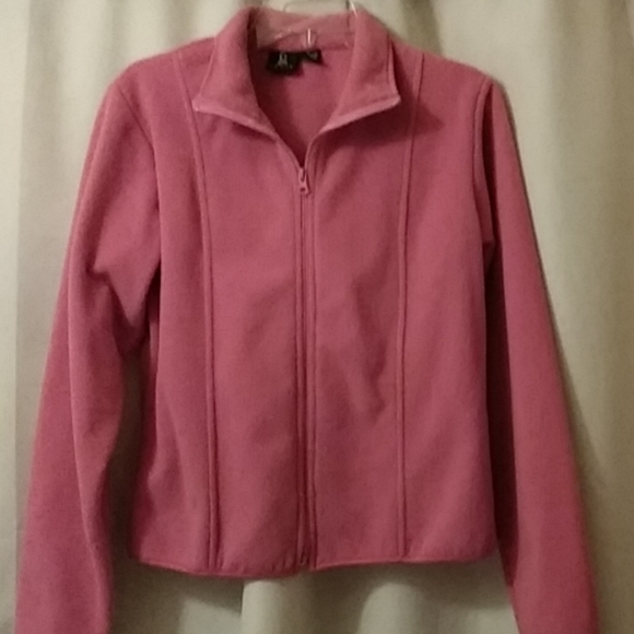 Jacket is a very soft, stretchy velour, zippered, and reaches to about 10 inches below the belt.