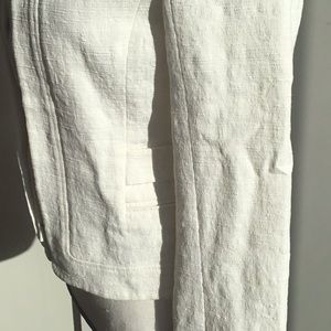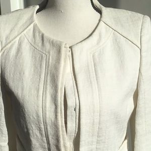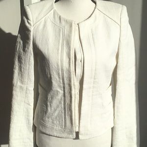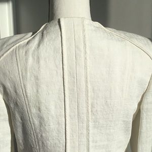 White cropped jacket perfect for work. Looks great over a dress, skirt or pants. Good for spring. Chic double line front and design through out.