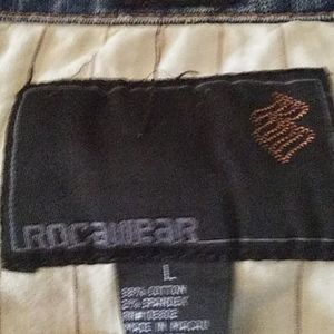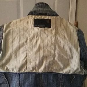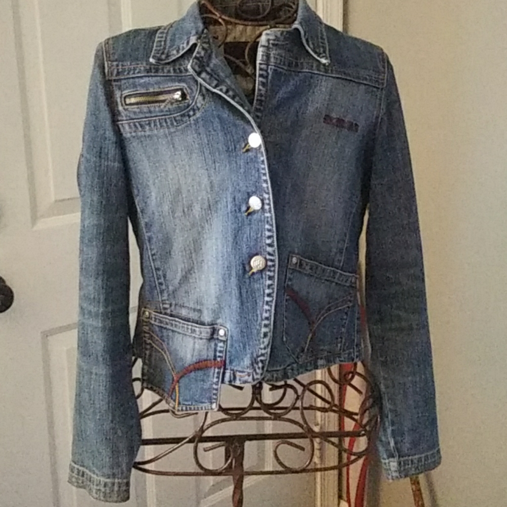 A fabulous denim jacket with bold silver buttons featuring offset pockets. Breast zipper paneled back. Partially lined. Accented with gold&brown stitching. A must for any closet.