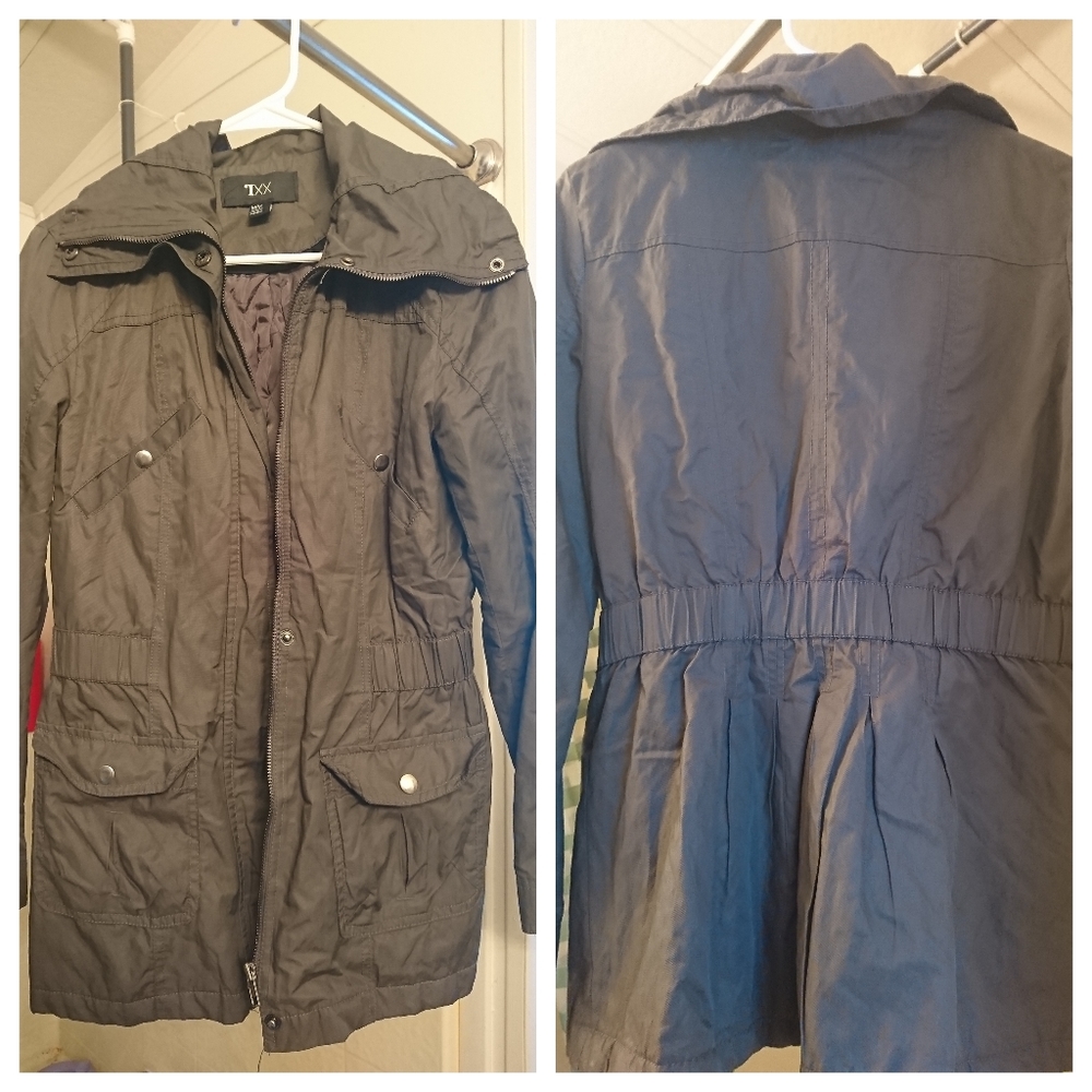This is a dark green rain jacket. Very cute and has a few pockets.