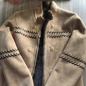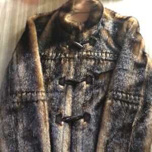 Reversible Jacket Size Large. One side is A light Brown Suede with a zipper closure, while the other side is a Dark Brown Faux Fur with light brown undertones and toggle closure