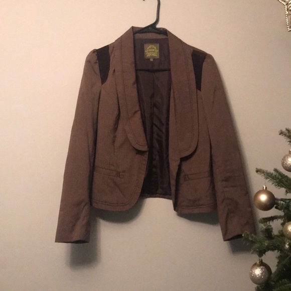 Brown striped jacket with elbow patches that are a deep brown pair well with boots heals booties