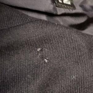 Navey womens suit jacket double breasted look. 2 small holes in lapel.