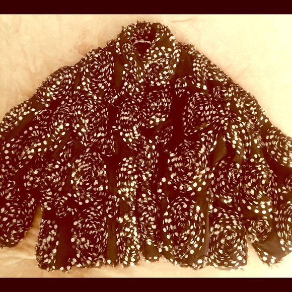 Polka dot print with floral collage. Amazing details. Wear up or down with this classy signature piece that’s a statement all by itself.
