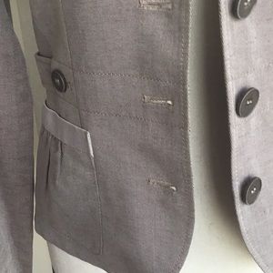 Hugo boss spring jacket. Great for work over dress, pants or skirts. Great details on the pockets and side that adds fun, sporty look. In shuttle shiny blueish/grey tone with silver tone accents around the sleeves and pockets