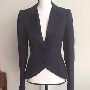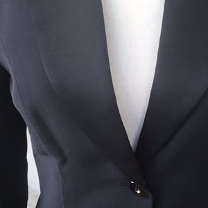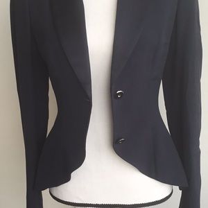 Navy blue fitted jacket with tuxedo like satin lapels. Hi/low waistline. Elegant, feminine and sexy look. Lines accentuate your waist line. Great over anything. Very chic. In prestige condition