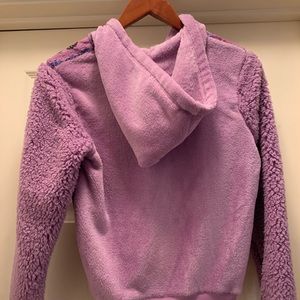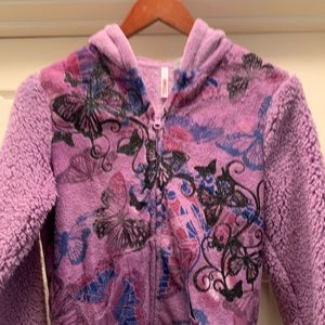 Warm, soft and fuzzy, purple hoodie. Front zipper with a butterfly design on the front. Solid back. New, never worn without tags.